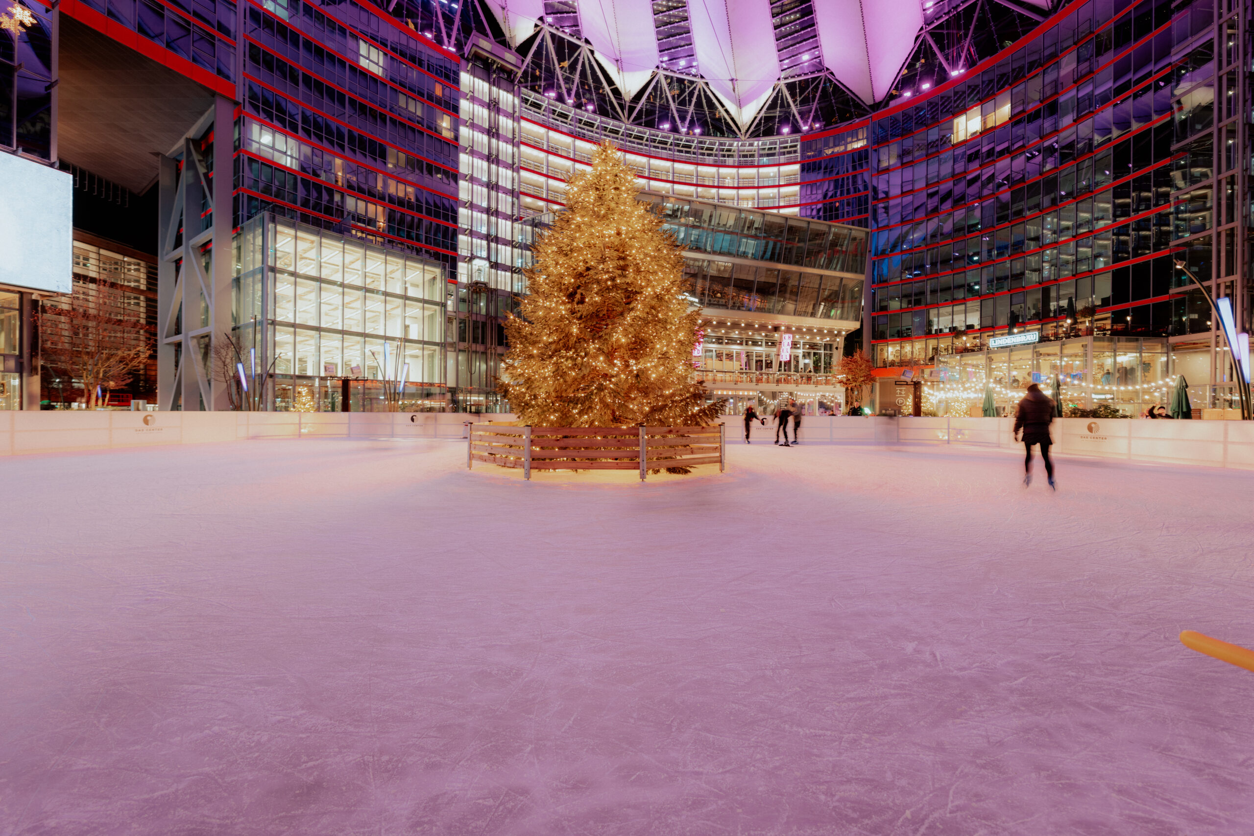 Außergewöhnliche Atmosphäre: Draußen Eislaufen und doch geschützt durch das imposante Dach des Centers am Potsdamer Platz in Berlin